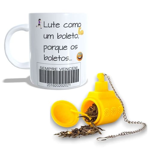 Caneca Xícara Porcelana Presente Boletos Com Infusor de Chá