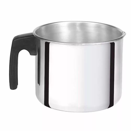 Canecão de alumínio com orla (dobra na boca) com cabo de baquelite.