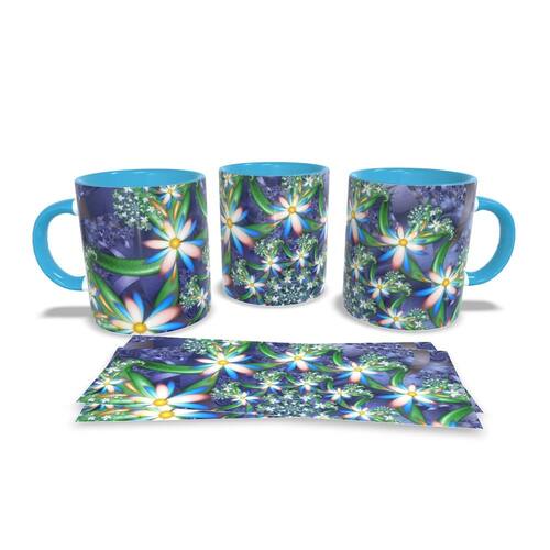 Caneca personalizada de porcelana de alto brilho, com interior e alça Azul com linda Estampa da Coleção Flores.