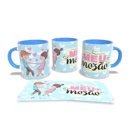 Caneca personalizada de porcelana de alto brilho, com interior e alça Azul com linda Estampa da Coleção Dia dos Namorados.