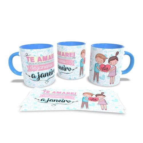 Caneca personalizada de porcelana de alto brilho, com interior e alça Azul com linda Estampa da Coleção Dia dos Namorados.