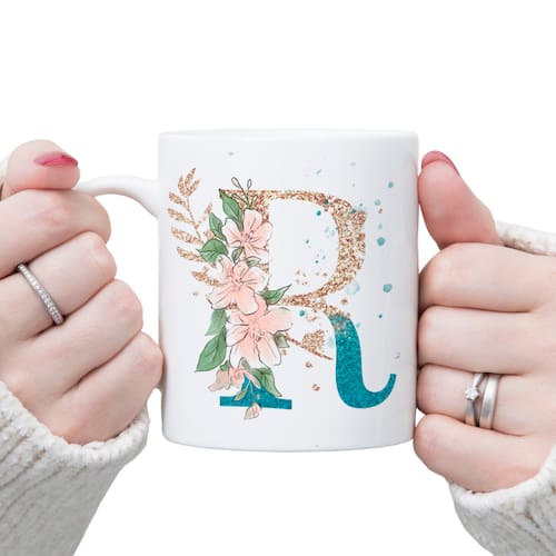 Caneca personalizada de porcelana de alto brilho, com interior e alça branca com linda Estampa Alfabeto Floral Glitter.