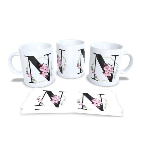 Caneca personalizada de porcelana de alto brilho, com interior e alça branca com linda Estampa Alfabeto Floral Gramur.