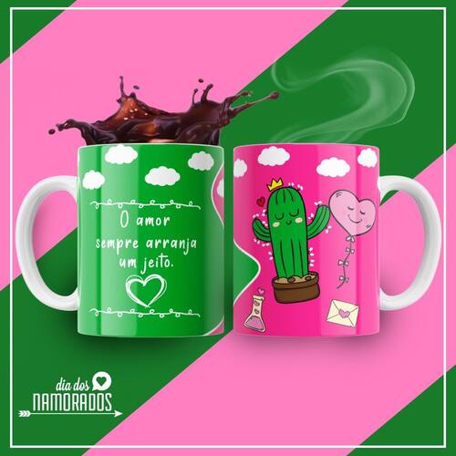 Caneca personalizada de porcelana de alto brilho, com interior e alça branca com linda Estampa da Coleção Dia dos Namorados.