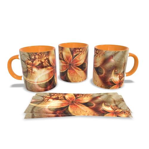 Caneca personalizada de porcelana de alto brilho, com interior e alça Laranja com linda Estampa da Coleção Flores.