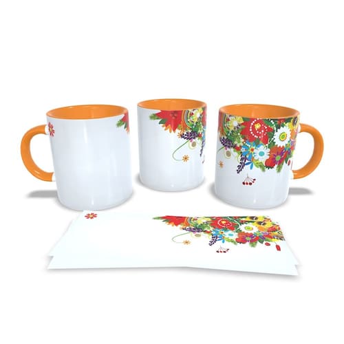 Caneca personalizada de porcelana de alto brilho, com interior e alça Laranja com linda Estampa da Coleção Flores.