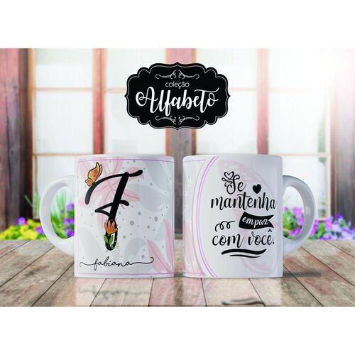 Caneca personalizada de porcelana de alto brilho, com interior e alça branca com linda Estampa Alfabeto Borboleta.