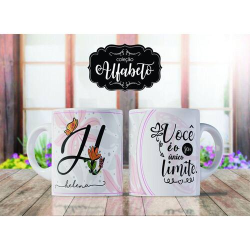 Caneca personalizada de porcelana de alto brilho, com interior e alça branca com linda Estampa Alfabeto Borboleta.