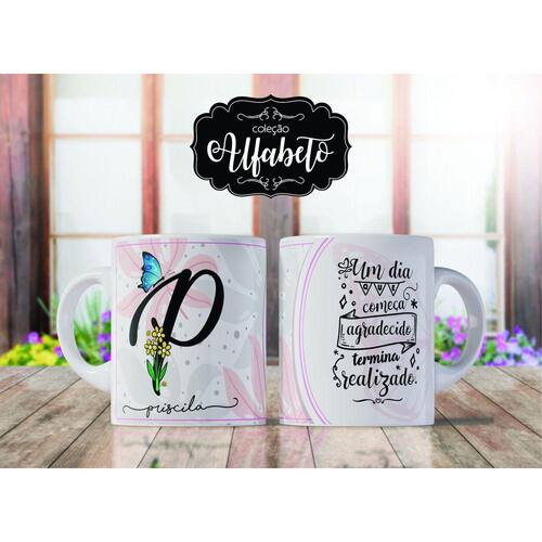 Caneca personalizada de porcelana de alto brilho, com interior e alça branca com linda Estampa Alfabeto Borboleta.