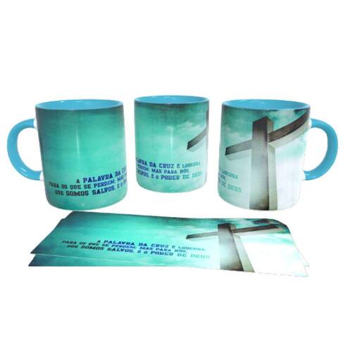 Caneca personalizada de porcelana de alto brilho, com interior e alça Azul com linda Estampa Tema Evangelico.
