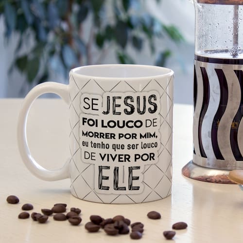 Caneca personalizada de porcelana de alto brilho, com interior e alça branca com linda Estampa Tema Evangelico "Ele Vive".