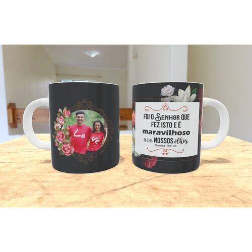 Caneca personalizada de porcelana de alto brilho, com interior e alça branca com linda Estampa Tema Evangelico.