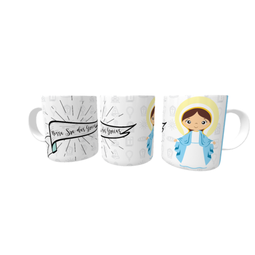 Caneca de porcelana de alto brilho, com alça e interior branca Coleção Santos da Igreja Catolica.