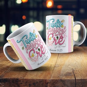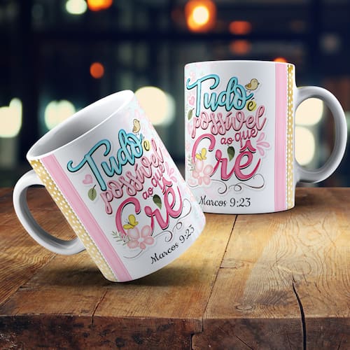 Caneca personalizada de porcelana de alto brilho, com interior e alça branca com linda Estampa Tema Evangelico.