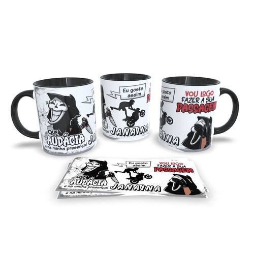 Caneca personalizada de porcelana de alto brilho, com interior e alça Preta com a Estampa Amostradinho.