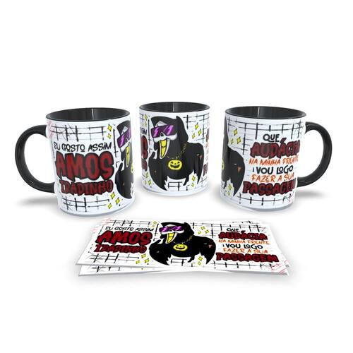 Caneca personalizada de porcelana de alto brilho, com interior e alça Preta com a Estampa Amostradinho.