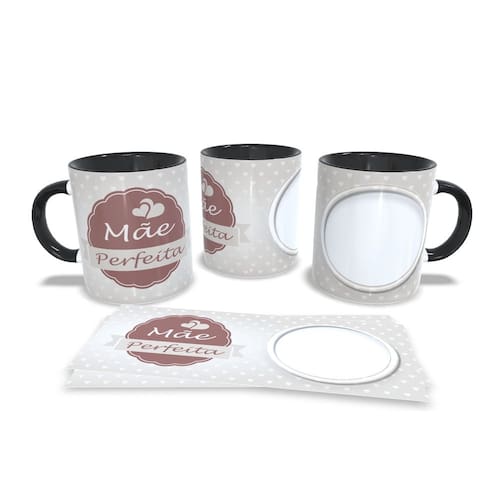 Caneca personalizada de porcelana de alto brilho, com interior e alça Preta com linda Estampa da Coleção dia das Mães.