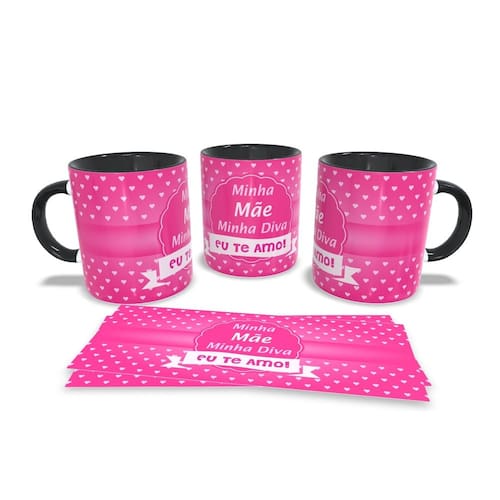 Caneca personalizada de porcelana de alto brilho, com interior e alça Preta com linda Estampa da Coleção dia das Mães.
