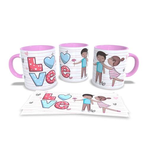 Caneca personalizada de porcelana de alto brilho, com interior e alça Rosa com linda Estampa da Coleção Dia dos Namorados.