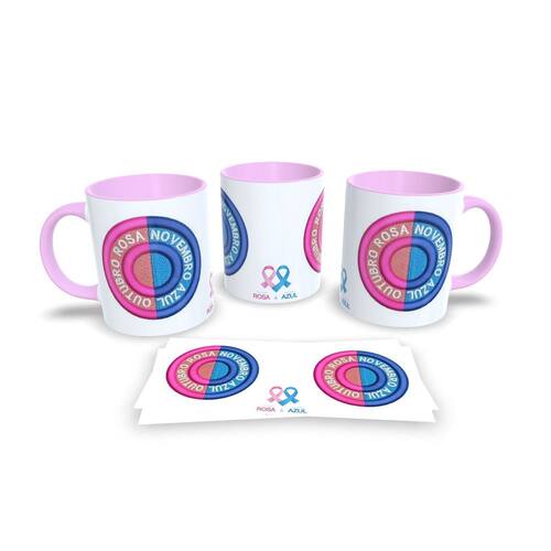 Caneca personalizada de porcelana de alto brilho, com interior e Alça Rosa Coleção Outubro Rosa e Novembro Azul.