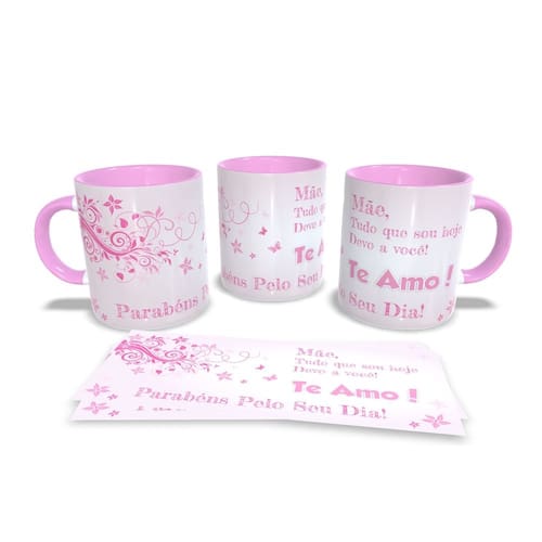 Caneca personalizada de porcelana de alto brilho, com interior e alça Rosa com linda Estampa da Coleção dia das Mães.