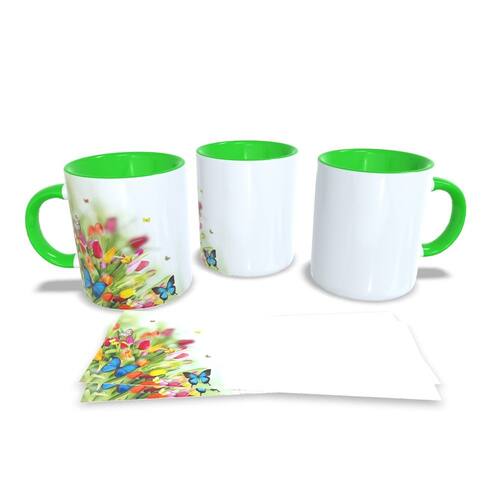 Caneca personalizada de porcelana de alto brilho, com interior e alça Verde com linda Estampa da Coleção Flores.