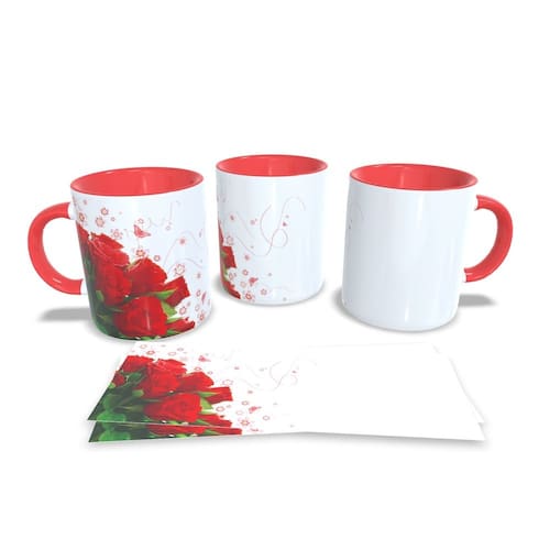 Caneca personalizada de porcelana de alto brilho, com interior e alça Vermelha com linda Estampa da Coleção Flores.