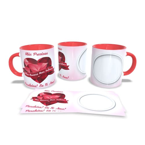 Caneca personalizada de porcelana de alto brilho, com interior e alça Vermelha com linda Estampa da Coleção dia das Mães.