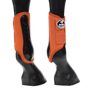 Proteção tipo caneleira para cavalo produzida em neoprene com reforço lateral em plástico reforçado, possui costuras nas bordas e 2 tira autocolantes reforçados para fechamento e regulagem permitindo ser utilizada em praticamente todos os portes de animais. Proteção indicada para as pernas dianteiras dos equinos.