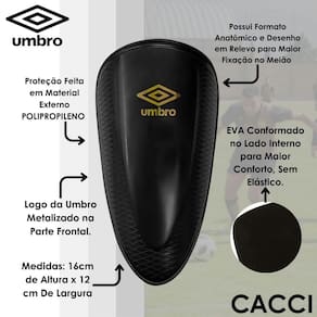 Caneleira de proteção feita em material rígido. Possui formato anatômico e desenho em relevo para maior fixação no meião, além de leve, possui EVA conformado no lado interno para maior conforto e respirabilidade. Logo da Umbro metalizado na parte frontal