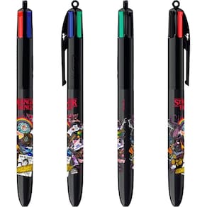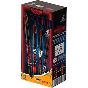 Descrição do produto : A Caneta BIC 4 Cores e um icone de mercado! Nesse modelo classico que conta com tintas classicas, com apenas um clique no botao, voce seleciona a cor que deseja. Cada Caneta ainda possui corpo decorado com tematicas de Stranger Things, dando um ar enigmatico e cheio de personalidade para essa caneta tao iconica da BIC. As Canetas contam com ponta media de 1.0mm com largura da linha de 0.32mm. Alem disso, nao travam durante o uso! Conjunto de Canetas com 12 Unidades. :