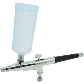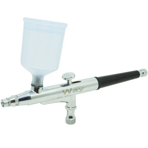 Com o Aerógrafo Importway dupla ação de 0.3 mm, o artista pode manipular com mais precisão, a quantidade de tinta e seu foco, e a emissão de ar apenas através do gatilho, sem a necessidade de ajustes para cada traçado. Geralmente o movimento vertical (pressão sobre o gatilho) aciona o ar comprimido, e puxando o gatilho para trás, abre-se a vazão de tinta. Pode-se conseguir no mesmo tiro através do movimento horizontal do gatilho, traços extremamente finos ou grossos. É o aerógrafo mais indicado para trabalho de desenhos, sombra e luz, onde é necessário grande precisão no volume de tinta empregado, e controle do foco. Como vantagem, temos a performance citada, como desvantagem, manutenção mais delicada devido a pinça central, além de possuir via de regra, dois reservatórios de 20 ml e outro de 40 ml. Este é um tipo de aerógrafo indicado para artistas experientes que tenham controle das cinco variáveis da pintura spray ou pulverizada a ar: distância (até o objeto sendo pintado), pressão, diluição (viscosidade da tinta), velocidade de aplicação, e o leque.