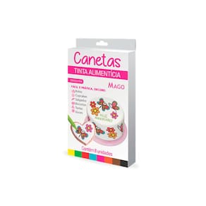 Caneta Alimenticia Fina C/8 Cores Mago - CARACTERÍSTICASCanetas com tinta alimentícia, recarregáveis com corante líquido ou corante em pó hidrossolúvel. Fáceis, práticas e sem sabor, ideais para decorar suas receitas!Use para pintar e desenhar pequenos detalhes em bolos, biscoitos doces e papel de arroz.Obs: a caneta só funciona em coberturas secas e duras. Ex: pasta americana.Kit com 8 canetas nas cores:- azul- marrom- preto- verde- vermelho- rosa- laranja- amareloTamanho aproximado: 14,5cmArmazenar em local seco e à temperatura ambiente. Evite exposição ao sol.INGREDIENTESÁgua, álcool de cereais e corante artificial para fins alimentícios. N??O CONT??M GL??TEN.REGRAS GERAISImagens ilustrativas, as cores podem alterar conforme o seu monitorTodas as informações divulgadas são de responsabilidade do fabricante/fornecedor.Caracter?sticas Gerais do Produto:Garantia: Sem Garantia Marca: Mago Ind?stria