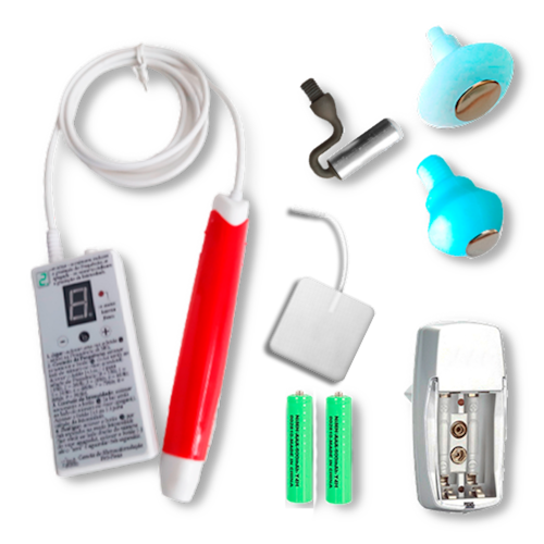 Código 0510C. Caneta de Eletroestimulação Pró-Fono: conjunto completo (uma Caneta de Eletroestimulação, uma Ponteiras Roller, uma Ponteira Pontos Motores e Regiões Pequenas, uma Ponteira Regiões Média, um Eletrodo Dispersivo, um Cabo de Conexão ao Gabinete Plástico, duas Pilhas Recarregáveis AAA e um Carregador de Pilhas).