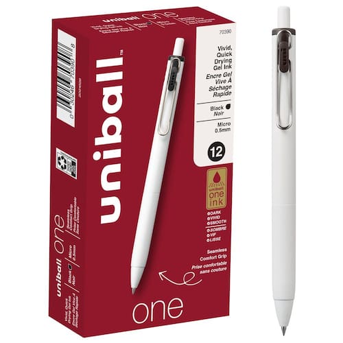 Uniball One caneta de gel pacote com 12; canetas micro pretas de 0,5 mm; canetas de tinta gel | Materiais de escritório vendidos pela Uniball são canetas; canetas esferográficas; canetas coloridas; - Tinta ultra-vívida – nossa revolucionária tinta em gel é formulada com pigmentos que não absorvem as fibras de papel, resultando em escrita e desenho ultra-vívidos e brilhantes - Design minimalista – o elegante barril branco com aderência antiderrapante integrada torna esta caneta uma ferramenta de escrita elegante para diário - Fórmula de secagem rápida – nossas canetas de gel de secagem rápida resistem a manchas, manchas e sangramento, tornando-as ideais para notas e tarefas nítidas e fáceis de ler - Clipes codificados por cores – o clipe de arame forte com mola abre para facilitar a fixação a documentos, cadernos ou pastas, e o indicador de cor na parte superior da caneta facilita a identificação da cor da tinta de gel - Precisão e controle – nossa micro ponta de 0,5 mm traz mais precisão e precisão para linhas e letras, enquanto a aderência de borracha firme garante controle preciso enquanto você cria