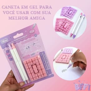 Com ponta fina de 0.5mm, tinta gel retrátil na cor preta e no kit acompanham as cores lilás e rosa.