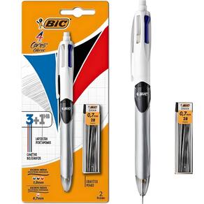 3 cores de tinta mais uma lapiseira 2 HB em uma para uma expressão divertida e colorida Ótimo para anotações, edição, organização de cópia, correção de papéis, bullet journaling, e mais Escreve em lápis preto, azul, vermelho e grafite Esferográfica média de 1,0 mm e lápis de 0,7 mm em um para conveniência e versatilidade Inclui 12 refis de grafite e 5 borrachas (recargas esferográficas vendidas separadamente com 4 cores em 1 pacote)