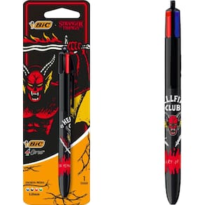 A Caneta BIC 4 Cores e um icone de mercado! Nesse modelo classico que conta com tintas classicas, com apenas um clique no botao, voce seleciona a cor que deseja. Cada Caneta ainda possui corpo ilustrado com Demogorgon, dando um ar enigmatico e cheio de personalidade para essa caneta tao iconica da BIC. As Canetas contam com ponta media de 1.0mm com largura da linha de 0.32mm. Alem disso, nao travam durante o uso! Conjunto de Canetas com 1 Unidade.