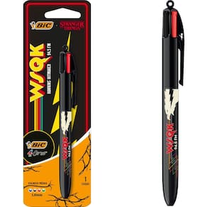 A Caneta BIC 4 Cores e um icone de mercado! Nesse modelo classico que conta com tintas classicas, com apenas um clique no botao, voce seleciona a cor que deseja. Cada Caneta ainda possui corpo ilustrado com Demogorgon, dando um ar enigmatico e cheio de personalidade para essa caneta tao iconica da BIC. As Canetas contam com ponta media de 1.0mm com largura da linha de 0.32mm. Alem disso, nao travam durante o uso! Conjunto de Canetas com 1 Unidade.