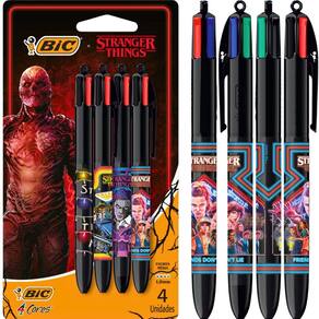 Descrição do produto : A Caneta BIC 4 Cores e um icone de mercado! Nesse modelo classico que conta com tintas classicas, com apenas um clique no botao, voce seleciona a cor que deseja. Cada Caneta ainda possui corpo decorado com os marcos das 4 primeiras temporadas de Stranger Things, dando um ar enigmatico e cheio de personalidade para essa caneta tao iconica da BIC. As Canetas contam com ponta media de 1.0mm com largura da linha de 0.32mm. Alem disso, nao travam durante o uso! Conjunto de Canetas com 4 Unidades. :