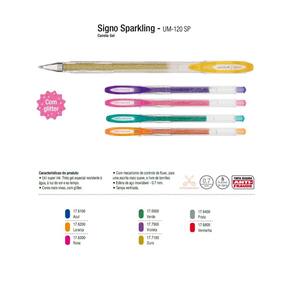 A caneta Signo Gel Sparkling tem tinta com glitter em sua composição, possui alta durabilidade, usabilidade e rendimento. Sua maior característica é o mecanismo de controle de fluxo para uma escrita suave (livre de borrões) e traçado contínuo sem falhas até o final de sua tinta. Signo Gel atende as mais diversas utilizações em papéis como Offset, Cartolina, Couche, Kraft, Reciclado, Papel Aquarelável, Canson, entre outros. Além de linda, a linha sparkling decora seus textos de forma vibrante, com cores bonitas e brilhantes!