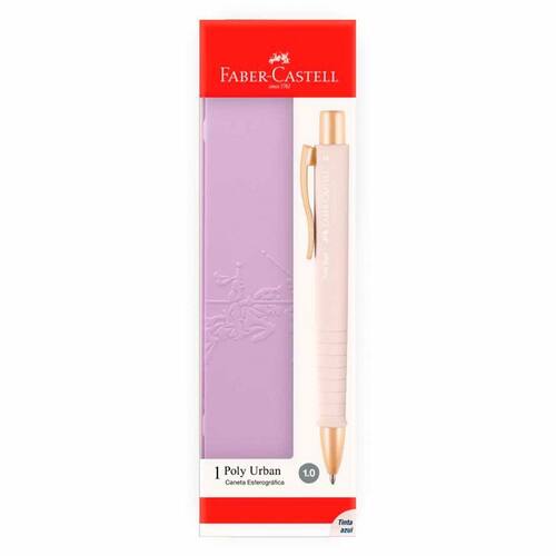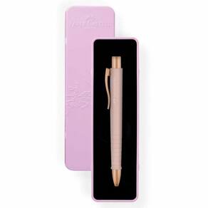 Estojo Poly Urban Rosa Gold em lata com caneta esferográfica retrátil com traço médio de 1.0mm para escrita super macia.