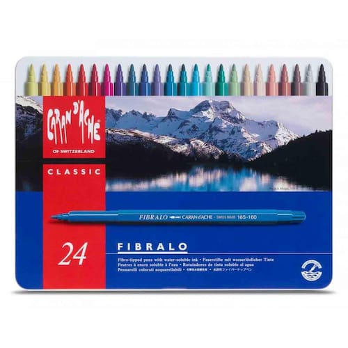 a caneta fibralo caran dache é um marcador de com possibilidade de aquarelar o desenho de acordo com a necessidade. Isso é possível pois a caneta fibralo é solúvel em água, o que garante efeitos incríveis e inesperados. Sua ponta de fibra indeformável possui uma qualidade inigualável e todo conjunto é acondicionado em estojo de metal. A caneta fribralo é a preferida entre os desenhistas, ilustradores e designers. Características: ponta de feltro tinta para papel á base dágua, lavável na maioria dos tecidos modernos. Cores fortes e brilhantes, grande capacidade de escrita de até 600m. Uso adulto profissional, não recomendado para crianças.