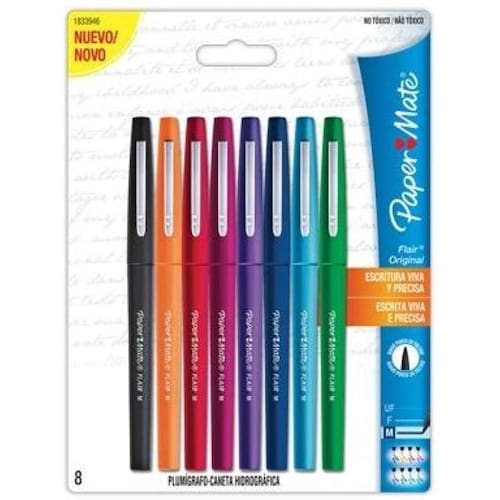 Características do Produto A caneta Paper Mate proporciona uma escrita intensa e suave . Seu corpo com formato anatômico oferece conforto na escrita para destros e canhotos. Especificações Caneta Flair Ponta de feltro 1,0mm Tinta a base de água Cor da tampa indica cor da tinta Ponta ultra finapara escrita precisa Embalagem Contém 8 unidades Marca: Não Informado Ean: 7501030683780