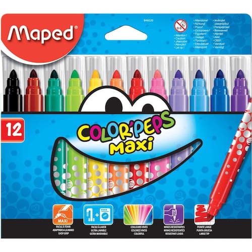 Caneta hidrografica Maxi Peps 12 Cores MapedUma caixa com 12 canetasLavável e de fácil remoção Ponta grossa 5,9 mm de diâmetro e resistente (amassa, mas não afunda)Tampa de segurança ventilada Longa duração Corpo largo. Fácil aderência às mãos de crianças pequenas Ultralavável.Classificação Fiscal: 96082000Comprimento: 19 cm Largura: 17 cm Altura: 1,70 cm Peso: 177 g