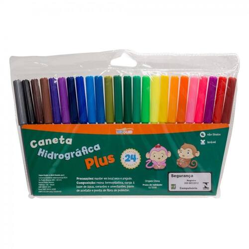 Caneta Hidrográfica Plus 24 cores certificado. formato redondo. embalagem em blister. ponta: 2.0 mm. características do produto lavável. corpo na cor da tinta. traço de 1mm. tampa asfixiantemente atóxico. carga de 1g. composição resina termoplástica, carga à base de água, corantes e umectantes, pavio de acetato e ponta de fibra de poliéster. Marca: Não Informado