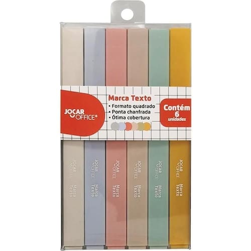 Caneta marca texto jocar office 6cores leonora estojo Marca: leonora Caneta marca texto jocar office 6cores Unidade: estojo Sua vida vai ficar ainda mais colorida e organizada com as canetas marca-texto jocar office. Sao 6 cores exclusivas, inspiradas nas tonalidades mais utilizadas no excel, para facilitar a marcacao de texto nas suas planilhas, relatorios e trabalhos escolares ou profissionais. Possui um design retangular moderno e diferenciado e pontas chanfradas, que garantem muito mais precisao no traco. Produto