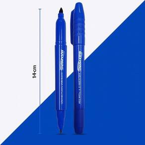 Seu grande diferencial está no design com dupla ponta - uma fina e outra ultrafina - que permite versatilidade na escrita, ideal tanto para identificação detalhada quanto para marcações mais visíveis. A cor azul oferece excelente contraste, facilitando a leitura em superfícies claras.