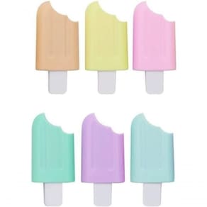 Conteúdo da Embalagem 6 mini marca-textos em formato de berinjela, com : azul, rosa, laranja, verde, roxo e amarelo.