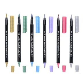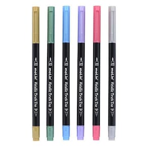 Tinta metálica, de alta pigmentação, com grande capacidade de tinta e com 2 pontas.Mantenha as canetas na horizontal, para um melhor efeito metalizado.Ponta Brush 4,5mm e ponta fina 2,5mm. Disponível em Bolsa com 6 cores.Item sem necessidade de Registro de Inmetro